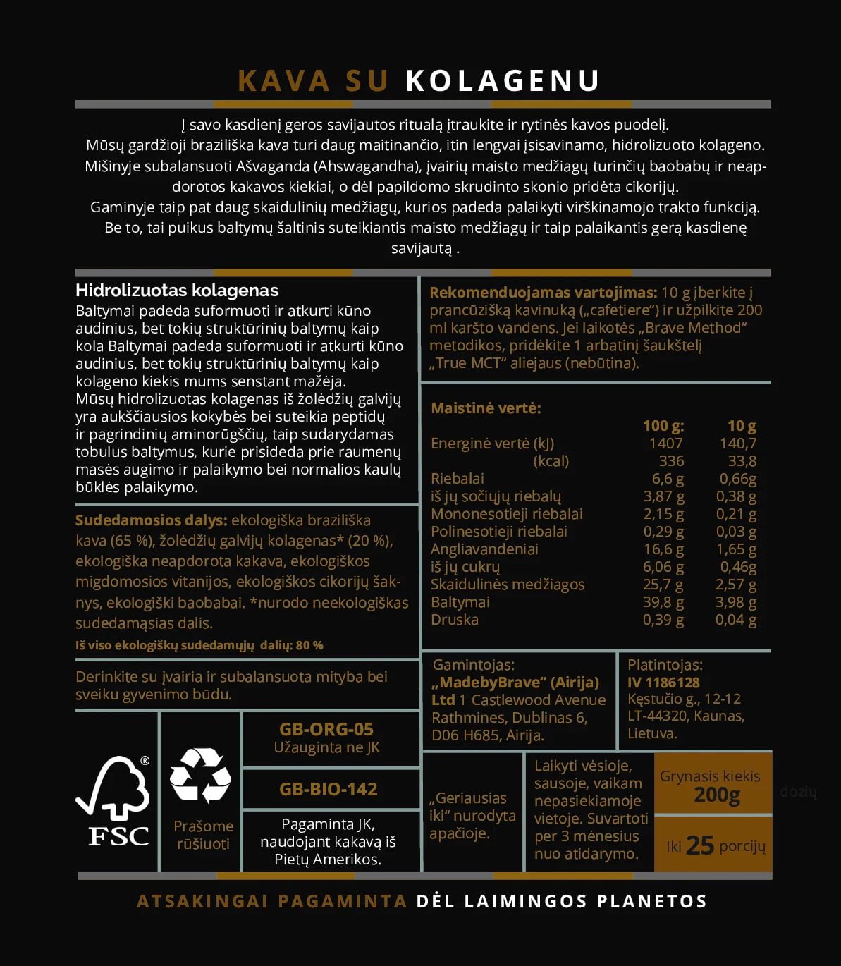 Sudedamosios dalys rankiniu būdu sumaišytos JK: ekologiška braziliška kava (65%), žolėdžių galvijų kolagenas* (20%), ekologiška neapdorota kakava, ekologiškos migdomosios vitanijos, ekologiškos cikorijų šaknys, ekologiški baobabai.