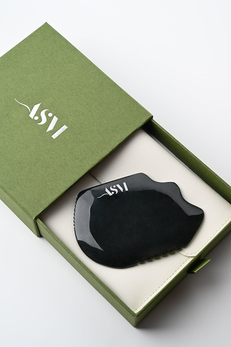 ASVI Guasha mentelė – tai elegancijos ir sąmoningo ritmų susiliejimas. Didesnis dydis ir išskirtinė ergonominė forma leidžia atlikti tiek veido, tiek kaklo, pečių ar dekoltė masažą su dar didesne nauda. Šaltas nefrito paviršius atpalaiduoja raumenis, skatina limfos tekėjimą ir ramina pojūčius – tai tikras grožio ritualas ir savęs priežiūros akimirka.
