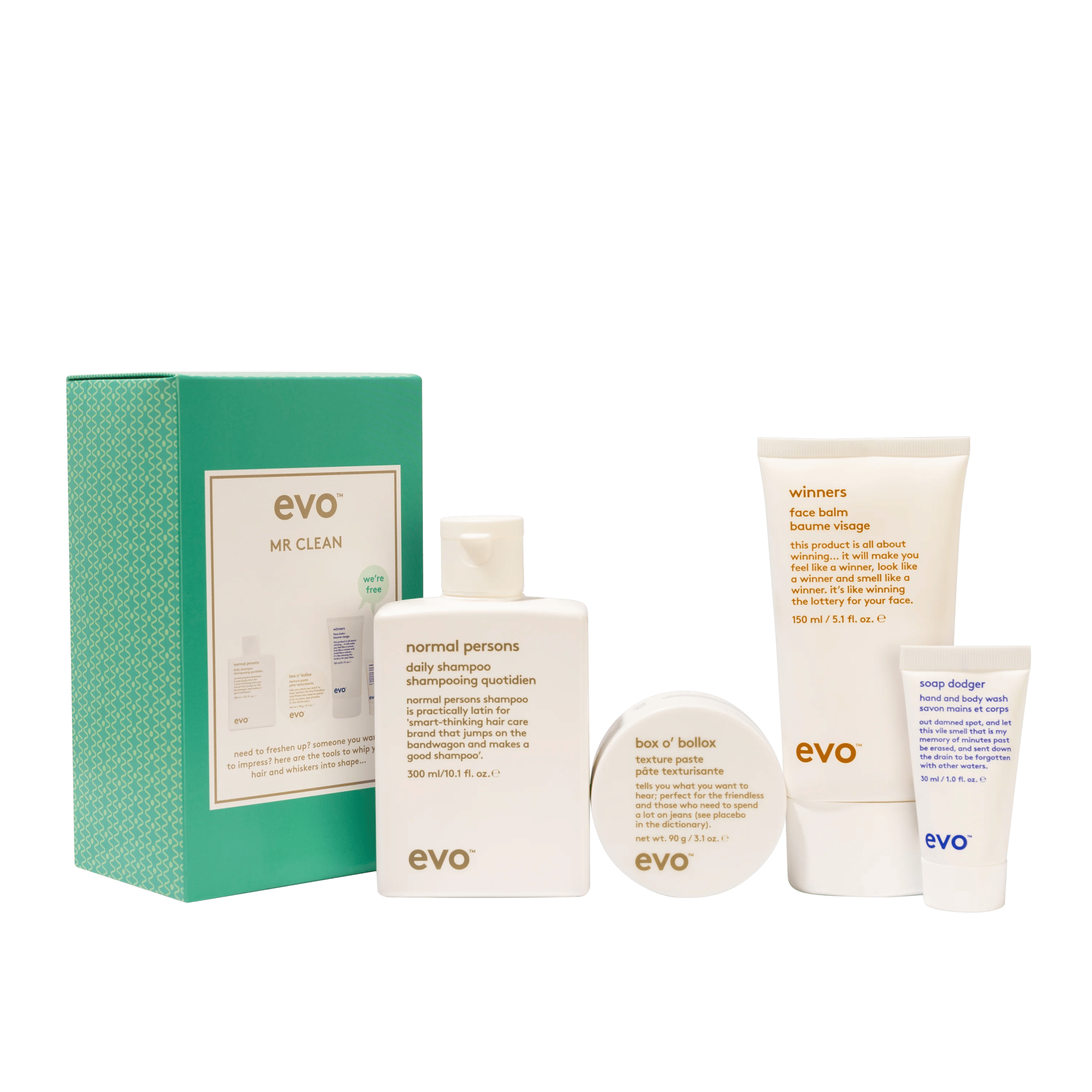 NORMAL PERSONS kasdienis šampūnas – giliai valantis, kasdienis šampūnas, puikiai pašalinantis kosmetinių priemonių likučius, nešvarumus ir sebumą. BOX O‘BOLLOX gyvenimą keičianti pasta – stiprios fiksacijos pasta, kuri sutvirtina, suteikia formą ir stiprų matinį efektą.