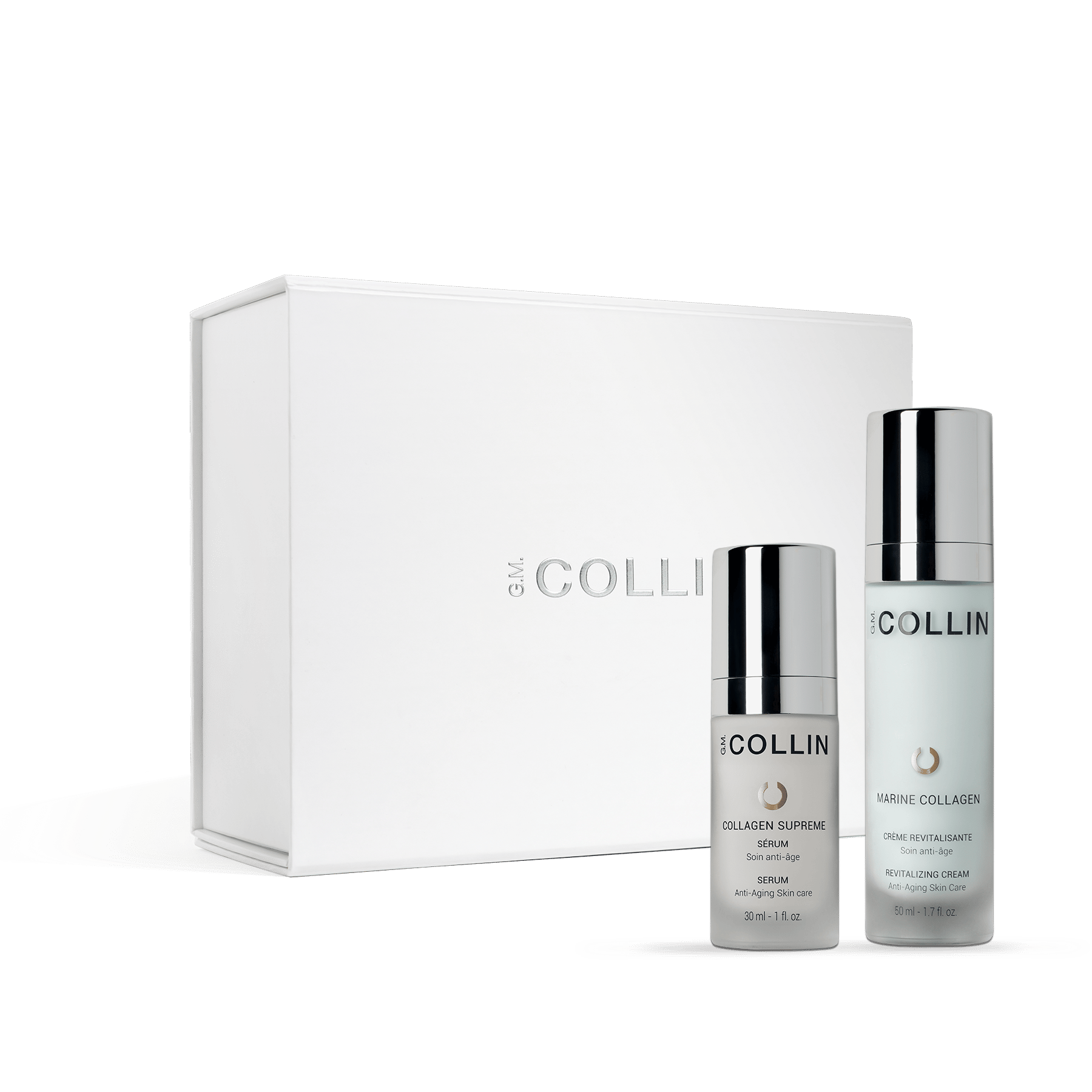 G.M. Collin Collagen šventinis rinkinys, tai priemonės odos drėgmei bei elastingumui palaikyti. Reguliariai naudojant serumą ir kremą, odai padedama įgauti putlumo ir švytėjimo.
