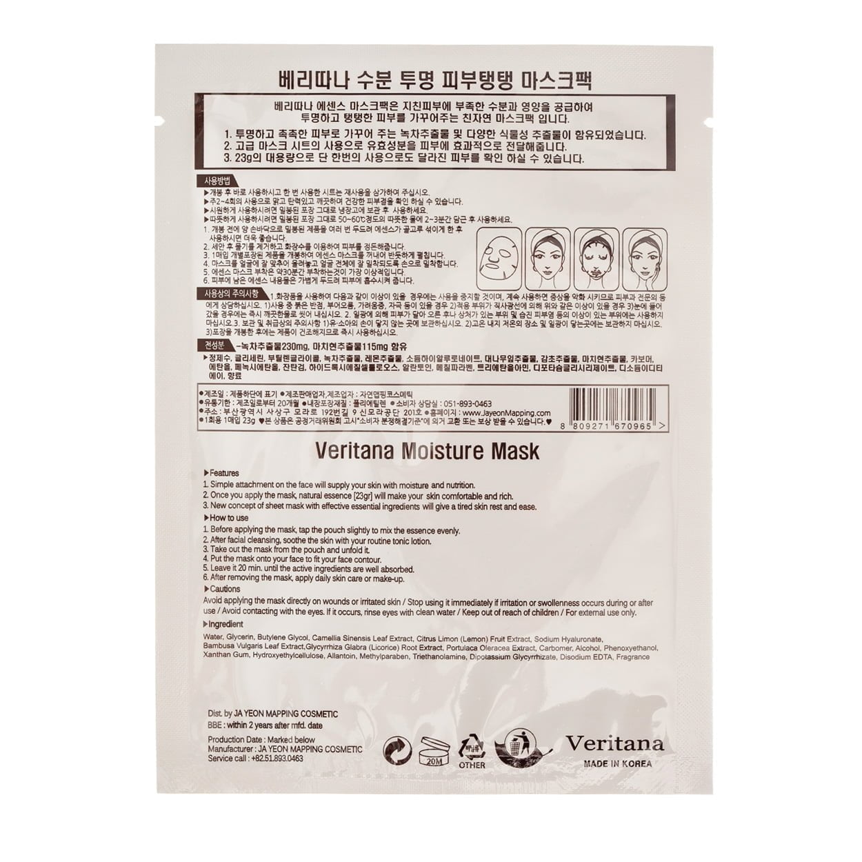 Ja Yeon Mapping Veritana Moisture Mask – tai vienkartinė lakštinė veido kaukė, skirta sausos, dehidratuotos ar pavargusios odos drėkinimo palaikymui. Kaukės audinys švelniai priglunda prie odos ir užtikrina tolygų veikliųjų medžiagų pasiskirstymą.