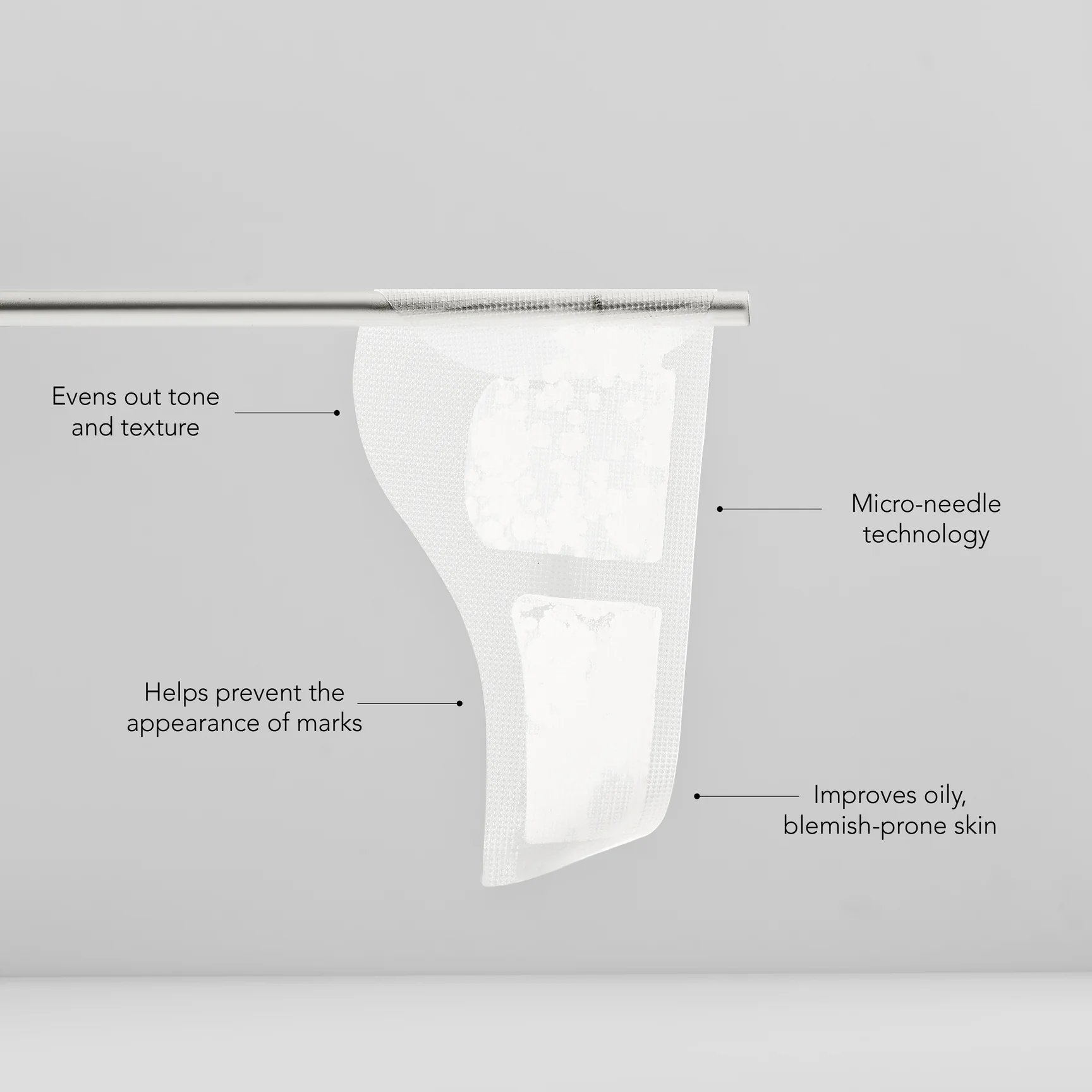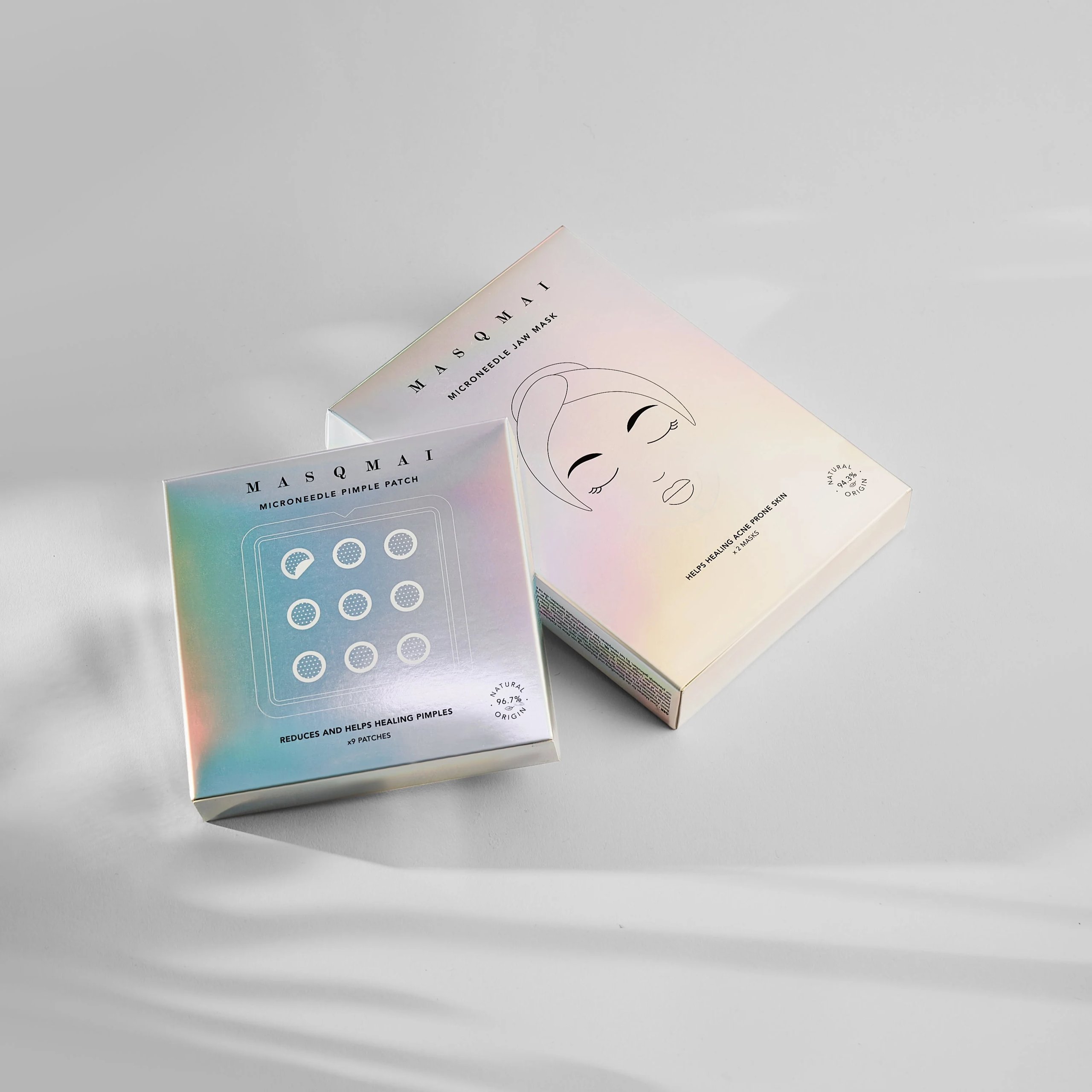 Inovatyvus duetas su microneedle – kaukė žandikaulio zonai ir punktiniai pleistriukai tikslinei probleminių vietų priežiūrai. Sukurtas palaikyti odos komfortą, švarą ir vizualinį tolygumą.