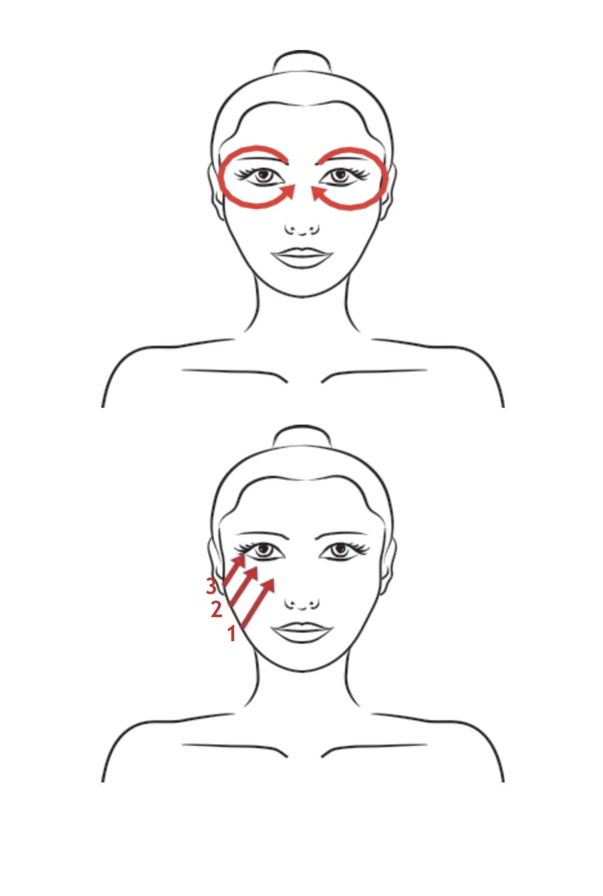 Masažas atliekamas švelniais slystančiais judesiais nuo veido centro į išorę. Pradedama nuo kaklo, tęsiama smakro, skruostų, akių srities kryptimi. Sukamieji judesiai aplink akis padeda sumažinti įtampos pojūtį ir sukuria atpalaiduojančią patirtį.