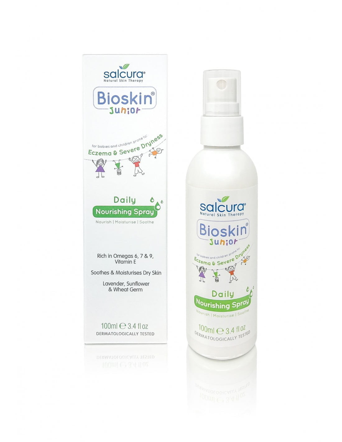 Salcura Bioskin Junior Daily Nourishing Spray – tai švelni, natūrali purškiama priemonė, skirta kasdienei jautrios ir problematiškos vaikų odos priežiūrai. Formulė sukurta naudojant natūralius augalinius ekstraktus ir aliejus, kurie padeda palaikyti odos drėgmės balansą, minkštumą bei stiprinti natūralų odos apsauginį barjerą.