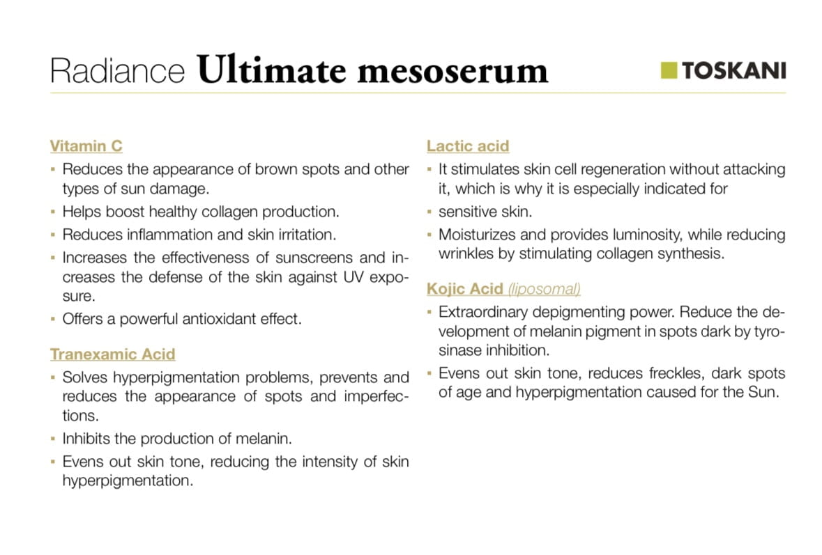 Aqua (Water), Propylene Glycol, Glycerin, Niacinamide, Ascorbic Acid, Tranexamic Acid, Glutathione, Panthenol, Tocopheryl Acetate, Sodium Hyaluronate, Sodium Hydroxide, Phenoxyethanol, Ethylhexylglycerin.