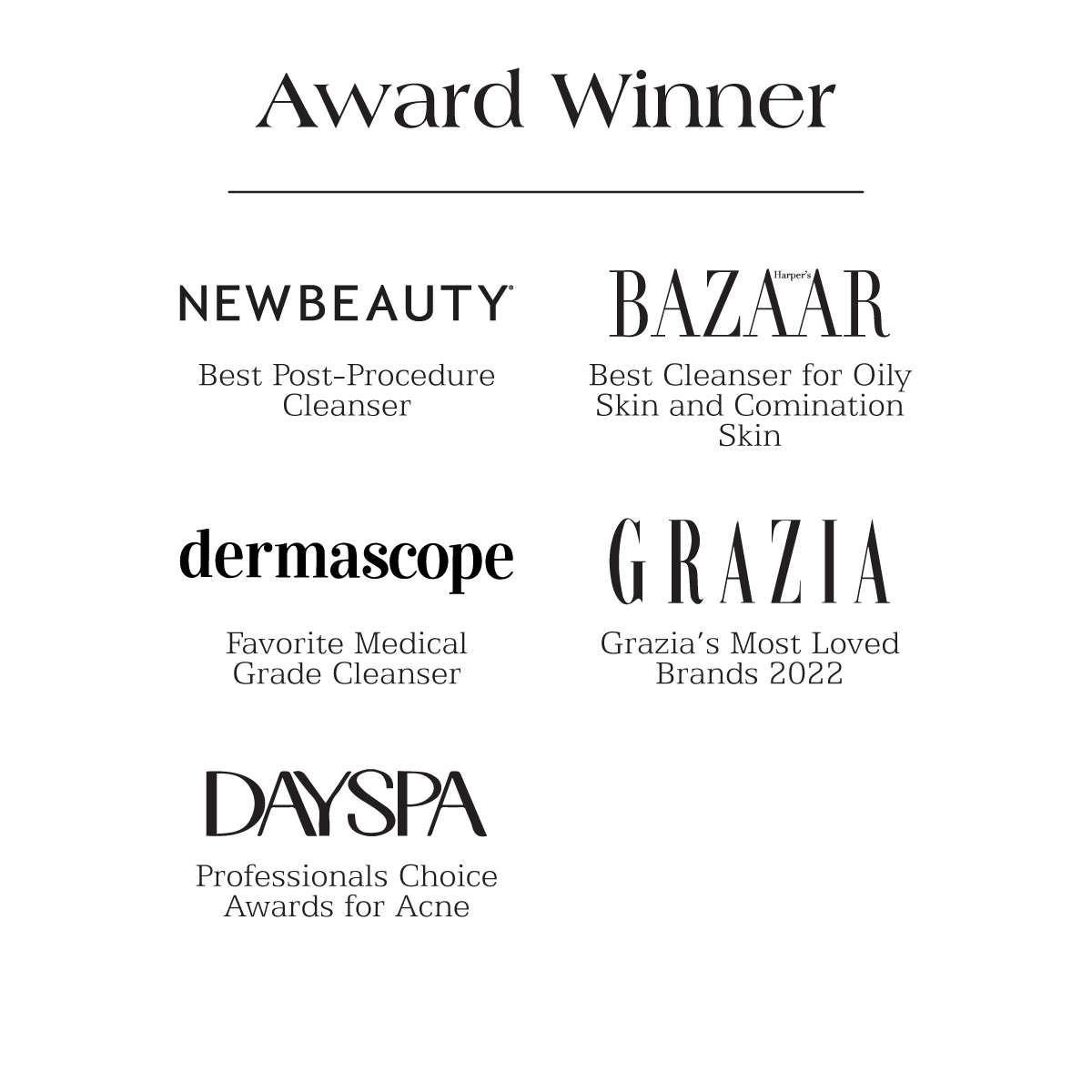 - Harper’s Bazaar: 2021 Product of the Year for Best Cleanser for Oily Skin